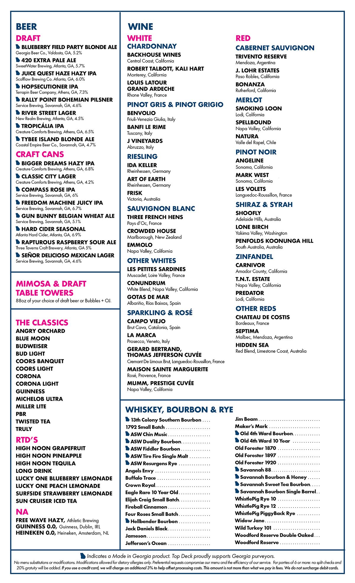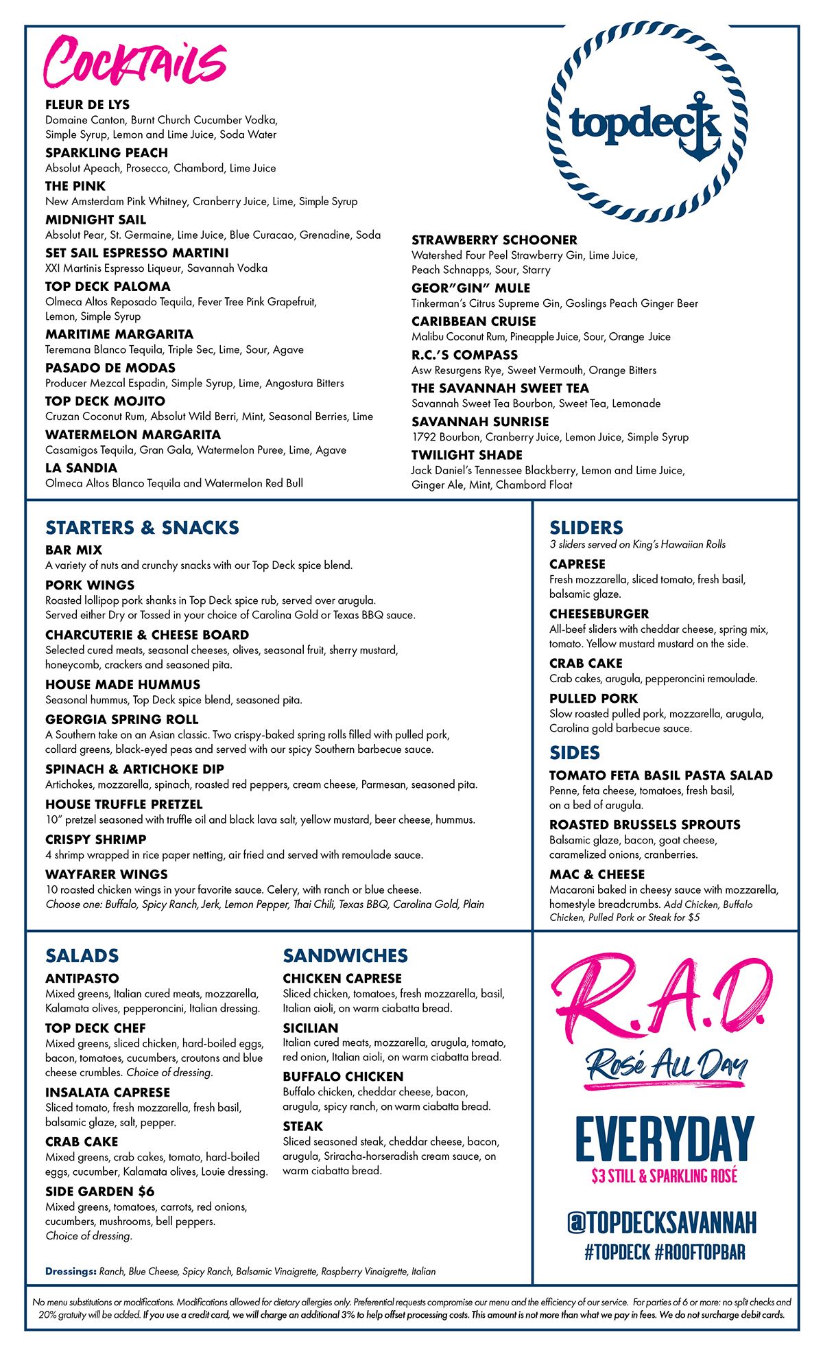 Top Deck’s prime location above the Cotton Sail Hotel, offers exceptional views of the Savannah River and the city, giving Savannah tourists and residents the perfect platform to relax and enjoy craft cocktails and delicious small plates, salads, charcuterie and sandwiches.